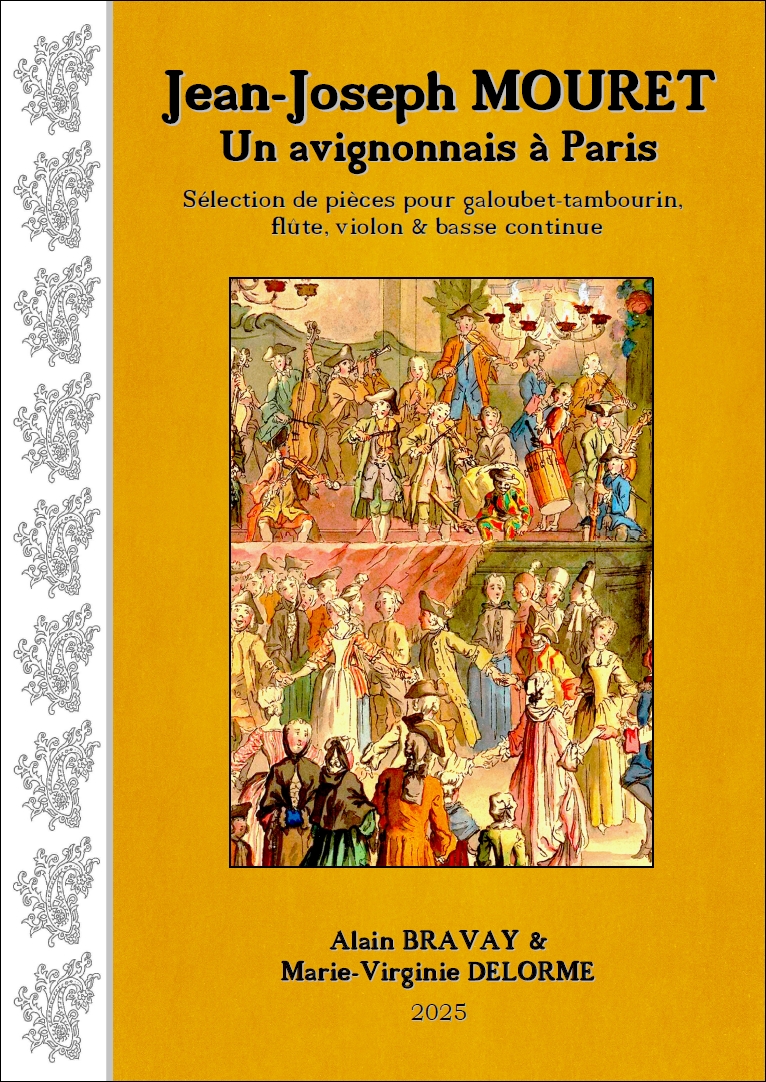 | A paraître, fin octobre 2025 : Jean-Joseph MOURET (1682-1738) - Un avignonnais à Paris Sélection de pièces pour galoubet-tambourin, flûte, violon & basse continue réalisée : des menuets, rigaudons, gavottes, bourrées, tambourins, rondeaux, airs, entrées, marche et chaconne. Arrangement pour galoubet-tambourin Alain BRAVAY, réalisation de la basse continue Marie-Virginie DELORME. Format 320x225, broché, 64 pages. L'ouvrage illustré est précédé d'une notice biographique et musicologique. Un recueil de musique d'ensemble pour instruments en 440 ou 415 Hz livré avec la partie séparée de galoubet-tambourin (20 pages). Jean-Joseph MOURET, brillant compositeur un peu oublié de la première moitié du XVIIIe siècle, méritait d’être remis à l’honneur. Né à Avignon dans une famille de joueurs de violon, il est sans doute à l'origine de la mode du tambourin provençal à Paris. En effet, il n’hésitait pas à mettre en valeur le galoubet-tambourin dans ses œuvres en le faisant jouer avec l’orchestre et cela, dès 1714. Il fut compositeur renommé des Grandes Nuits de Sceaux et de la Comédie Italienne, Ordinaire de la musique du Roi, chef d’orchestre de l’Académie Royale de Musique et directeur du Concert Spirituel. Son œuvre est importante et aborde tous les genres, de l’opéra aux musiques de danses en passant par les cantates sacrées. Voir en détail dans la BnF. |